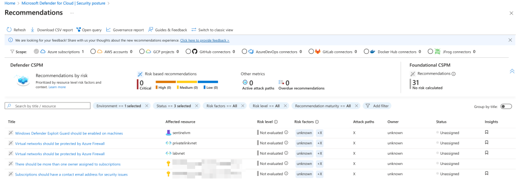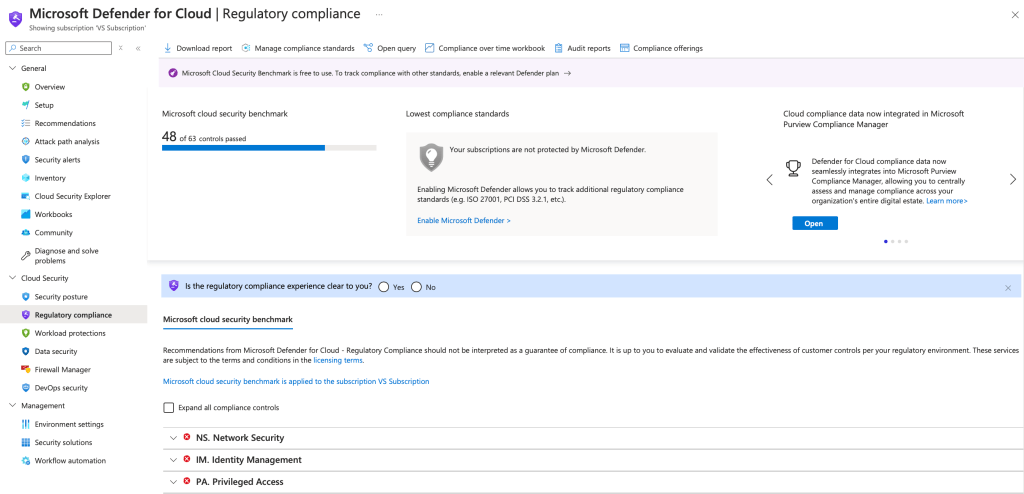 - By default, your subscriptions will be assigned the Microsoft Cloud Security Benchmark, which your environment will be evaluated against and provided recommendations for improvements.