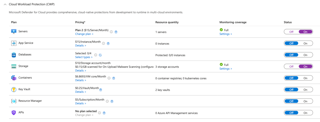 - Servers: Enable Defender for Servers to gain real-time threat detection, just-in-time VM access, and vulnerability assessments.