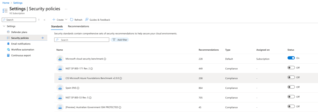 - Review and assign compliance standards (e.g., CIS, PCI-DSS) that align with your organisation’s requirements. Use Defender for Cloud to map resources to these standards and identify areas needing improvement.