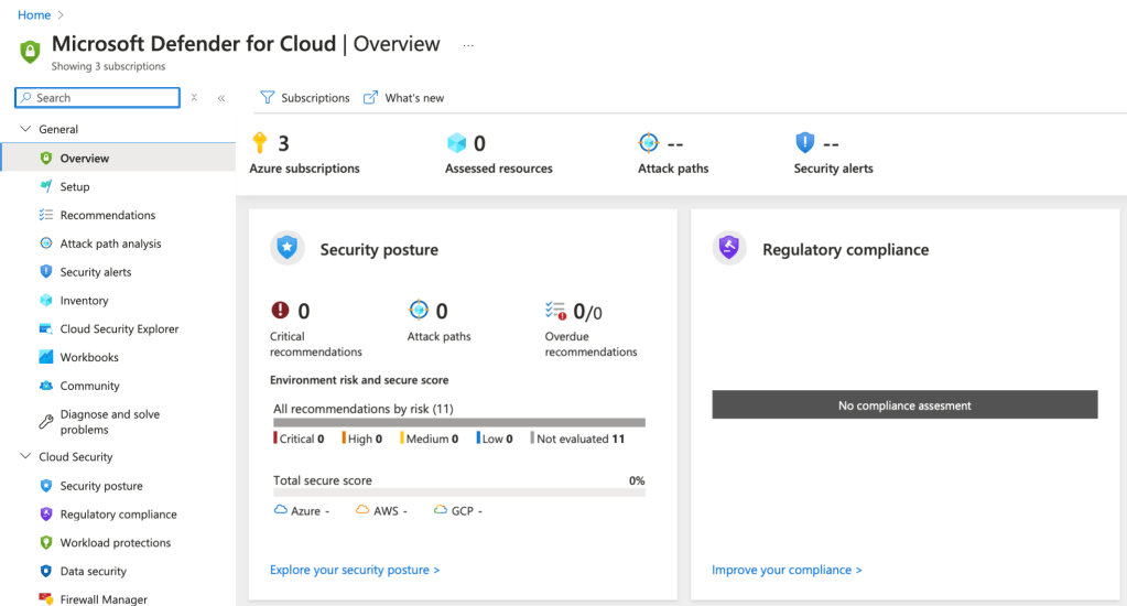 - You will be directed to the Defender for Cloud Overview dashboard, which provides a high-level view of your current security posture, regulatory compliance status, and active recommendations.