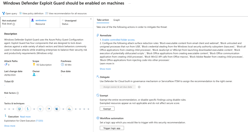 - Select a recommendation and review the guidance provided. Defender for Cloud often includes step-by-step instructions, CLI commands, or portal actions to resolve the issue.