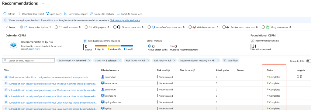 - Validate that your environment’s security posture improves as you apply Defender for Cloud’s guidance.